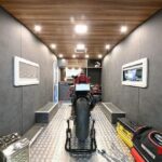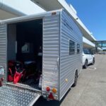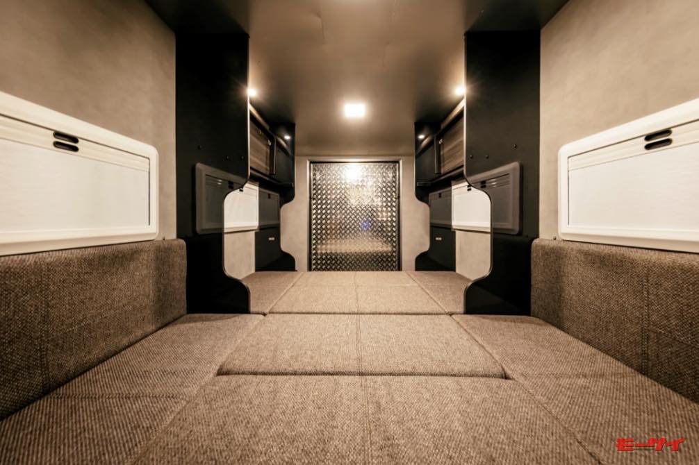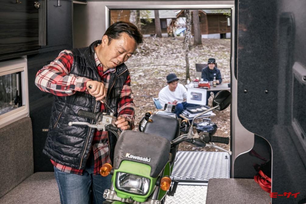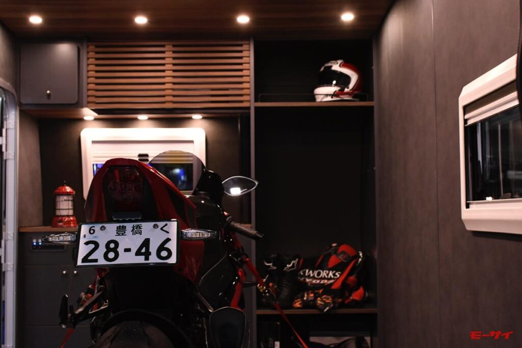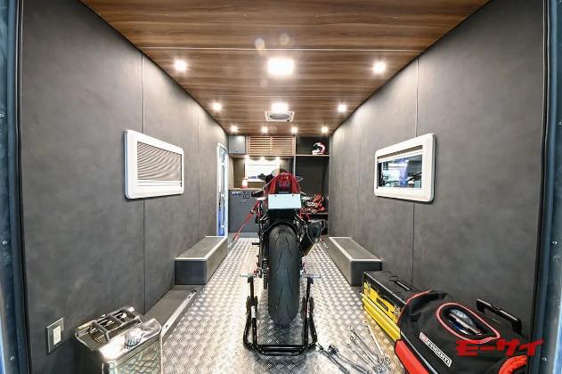 「Toy Hauler Living Garag」と「Toy Hauler Lounge」の開発では黒田さん自ら陣頭指揮をとり、実際のバイク経験を活かした工夫を車体の各所に仕込んでいます。例えば床には耐重量強化材を用い、バックドアは開くとそのままスロープになる仕様とすることで、バイクを簡単に載せたり下ろしたりすることがて可能となっています。もちろん車内にはアンカーポイントもしっかりと設置されているので、荷物や積載車両をベルトで締め付けて固定するのも簡単です。
