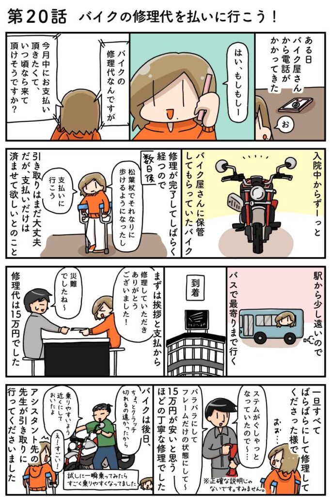 念願の二輪免許を取得して、バイクも購入、これからバイクライフを楽しむぞ!と思った矢先、転倒→入院……。そんな悲しきバイク女子イラストレーター・イシクラユカの事故からの復帰を描くエッセイ風マンガ。第20話は、バイクの修理代をお店に支払いに行った時のお話です。
