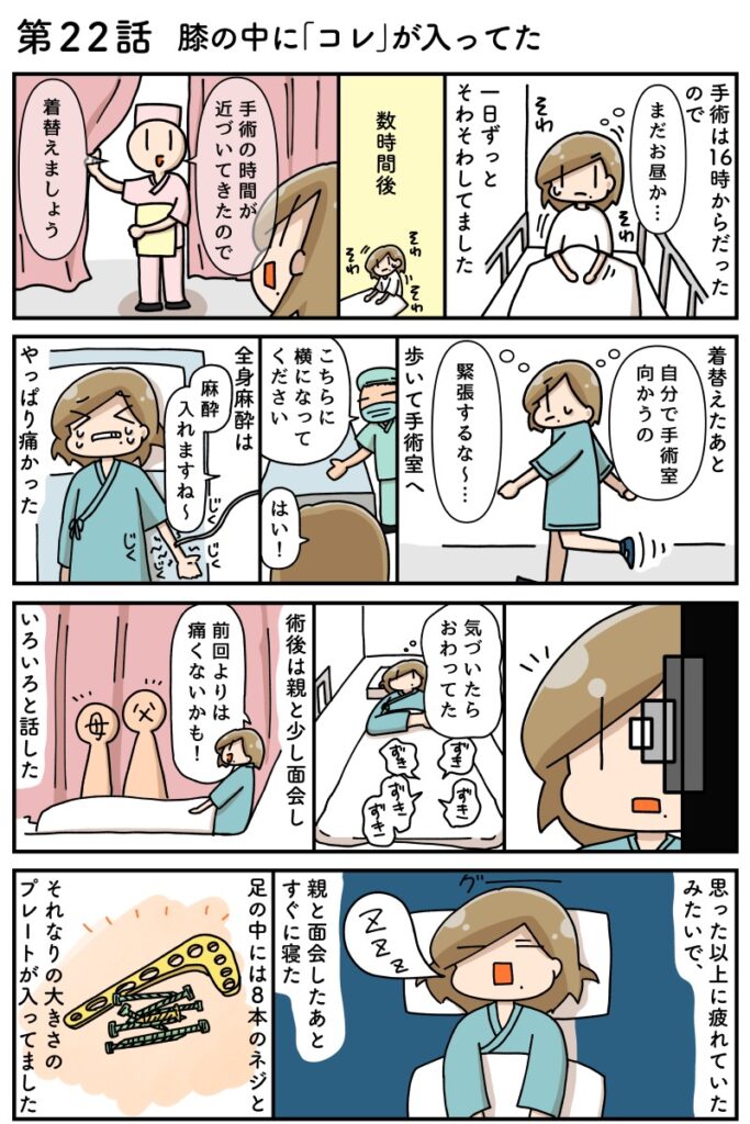 朝から手術まで時間があったため、ずっとそわそわ……。一番恐れいていたのは、全身麻酔です。あの痛みをまた味わうのかとブルーな気持ちでした。