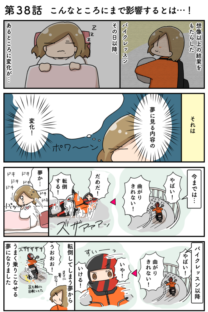 しかし!バイクレッスン後に見る夢の内容はどれも楽しいものばかり!バイクに乗ってお出かけして、「どこでも行けそうだ!」とわくわくした気持ちで運転していたり、今までは「曲がりきれない!」と焦っていたカーブも、とっさの判断で足を軸にカーブしていたり。