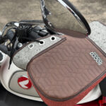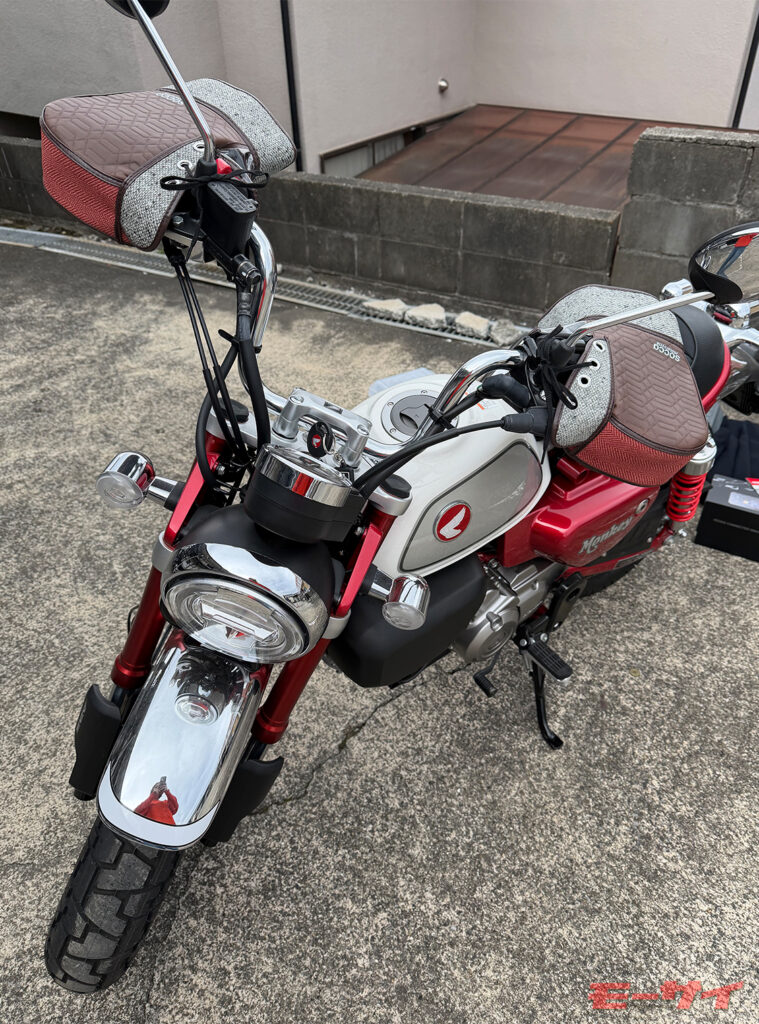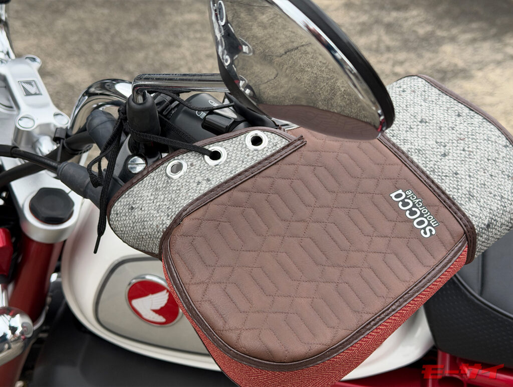 マンガの中でも紹介している「socca バイクハンドルカバー」の「チョコブラウン」というカラーです。側面が赤色、手の甲部分が茶色の配色になっています。色味がきつすぎなく、柔らかい印象のカラーです。赤色があることで、わたしのモンキー125にも雰囲気が合うんじゃないかと思いました。