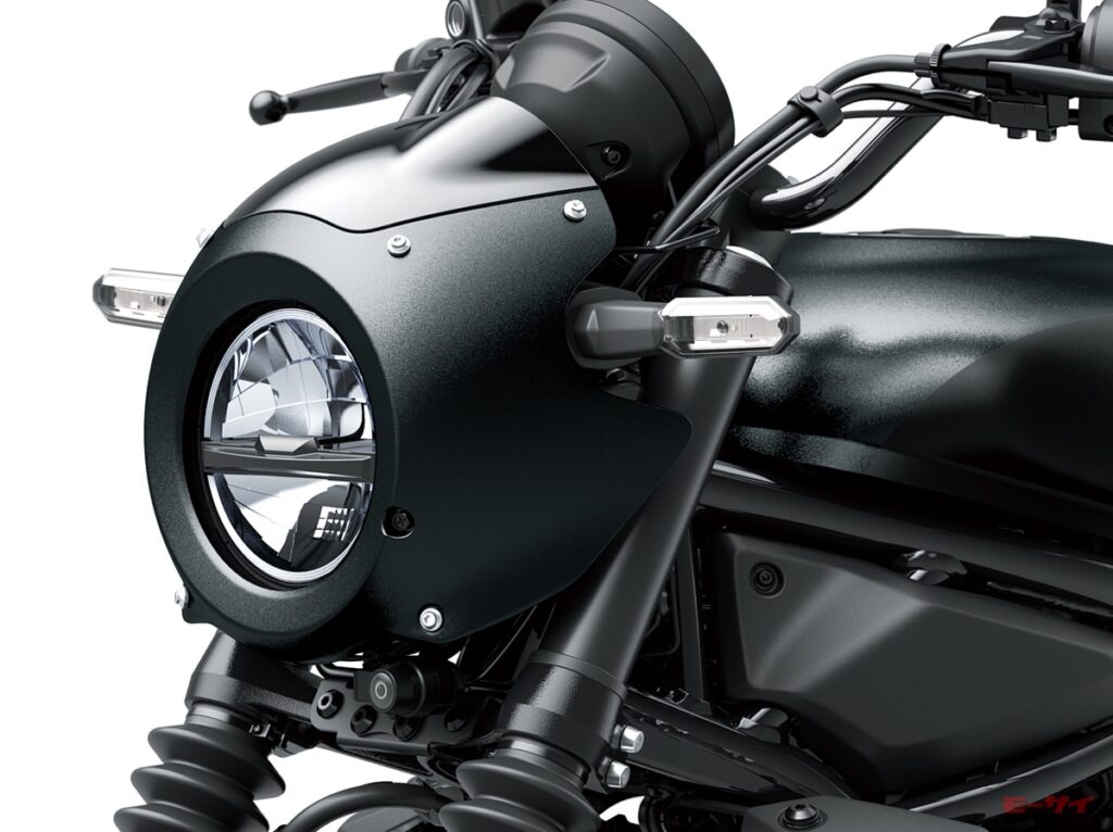 ガソリンタンクは上下方向の薄さを意識した構成で、容量はニンジャ400・Z400より2L少ない12L。ハンドルは日本人の好みにマッチしそうな形状だ。バックミラーはZ900RSやW800シリーズと同様のデザインだが、ステーはかなり短め。