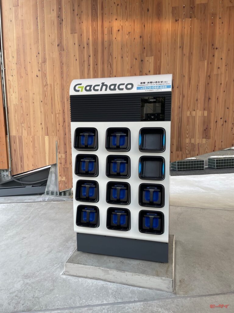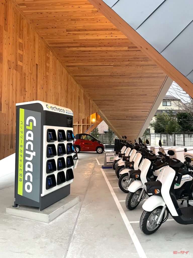 ■バッテリーの共通仕様化を進める国内二輪メーカー4社。現在のところホンダモバイルパワーパックe:を活用する方向で、それを用いたバッテリーシェアリングサービスをENEOSグループの「Gachaco」(ガチャコ)が展開している。現在は法人向けサービス限定となっているが、個人ユースのサービスもサービス内容、利用料金など含め検討中だという。写真はGachacoの東京都世田谷区にある駒沢2丁目ステーション(ENEOSマルチモビリティステーション)。