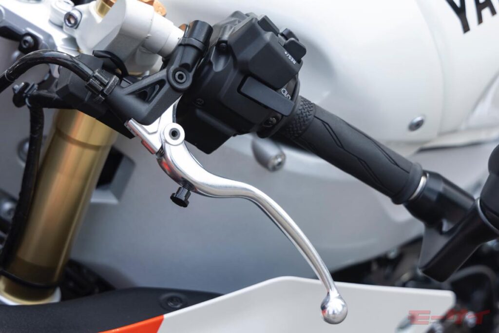 事前撮影会では、このXSR900GPにまたがるチャンスをゲット。トップブリッジの上側にクリップオンされたセパハンは、シート位置に対して低めかつ遠く、1980〜90年代のレーサーレプリカを思わせるけど、冷静に思い返してみれば、「当時物」より前傾がキツいイメージはない。
