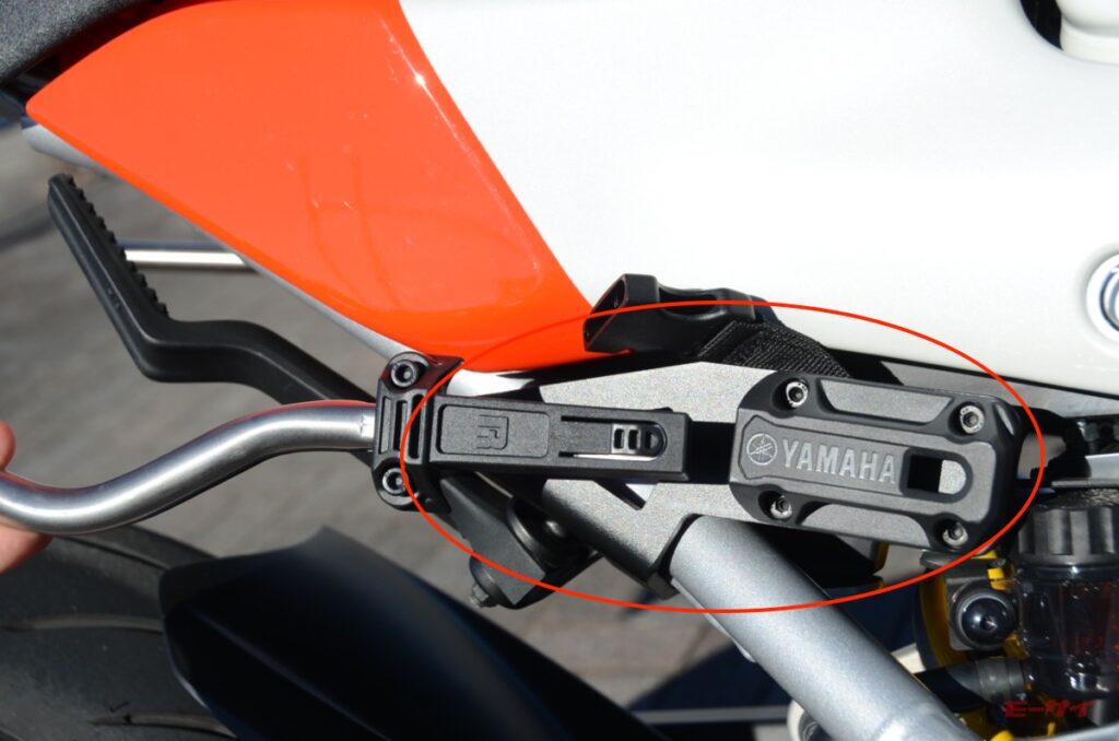 サイドバッグ用ステーはベース部分(赤い丸で囲った箇所)を残して取り外せる。ベース部分はコンパクトなのでXSR900 GPのルックスを邪魔しない。