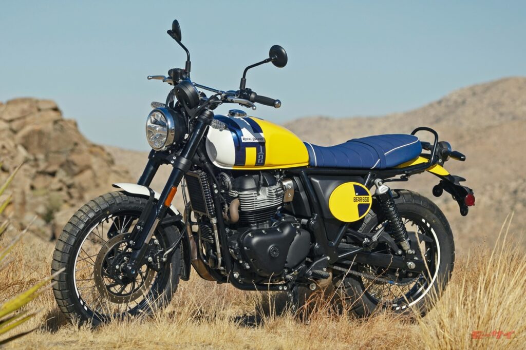 1960年、アメリカ・カリフォルニアの砂漠で行われたレース「ビッグ・ベア・ラン」。出走766人のうち完走197人という過酷なレースだったが、優勝を果たしたのはロイヤルエンフィールドの500cc単気筒マシン「フューリー」だった。その伝説的な活躍にオマージュしたのがこの新型車・ベア650である。