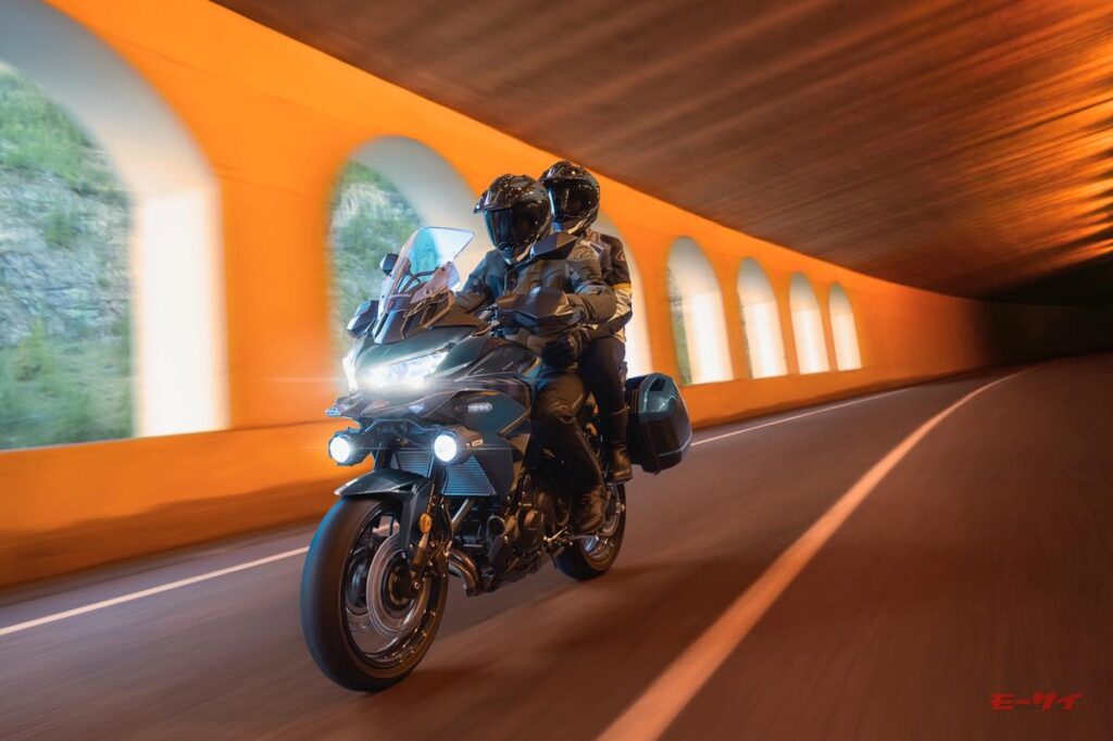 また、滑りやすい路面などでライダーをサポートするKTRC(カワサキトラクションコントロール)やスマートフォンと接続できる4.3インチフルカラーインストゥルメントも搭載して利便性も高い。さらにトップケースやパニアケースをはじめとした、アクセサリーでの拡張性の高さも魅力の1台と言える。