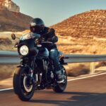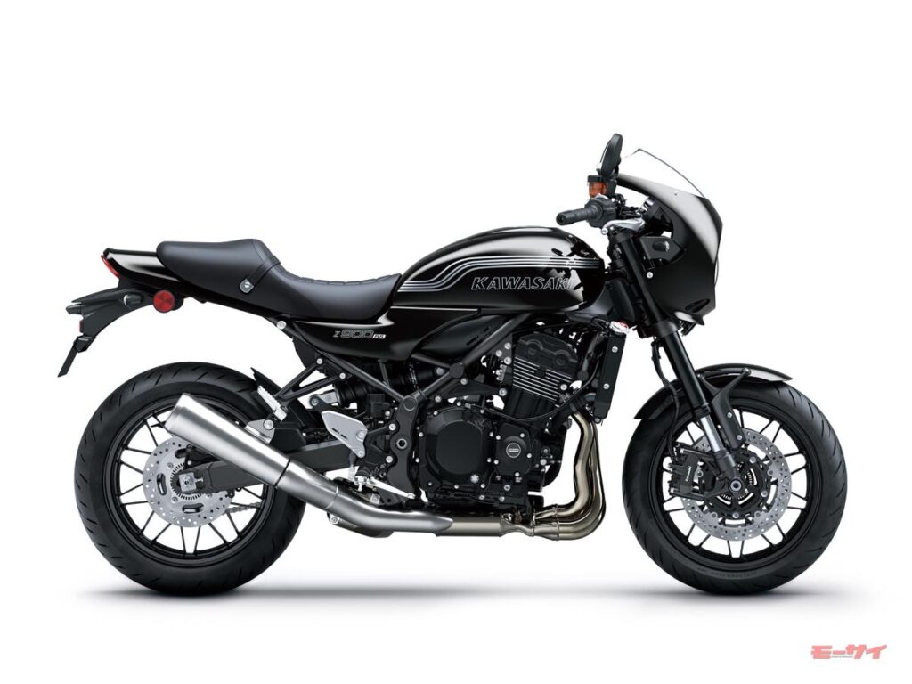 そして、特徴的なフロントカウルと、ブラック塗装のローポジションハンドル、専用シート採用でカフェレーサースタイルをまとったZ900RS CAFE(カフェ)は、エボニー(黒)基調としながら、カワサキの伝説的モデル「マッハシリーズ」へのオマージュとしてレインボラインのグラフィックを採用したのが注目ポイントで、価格は154万円。