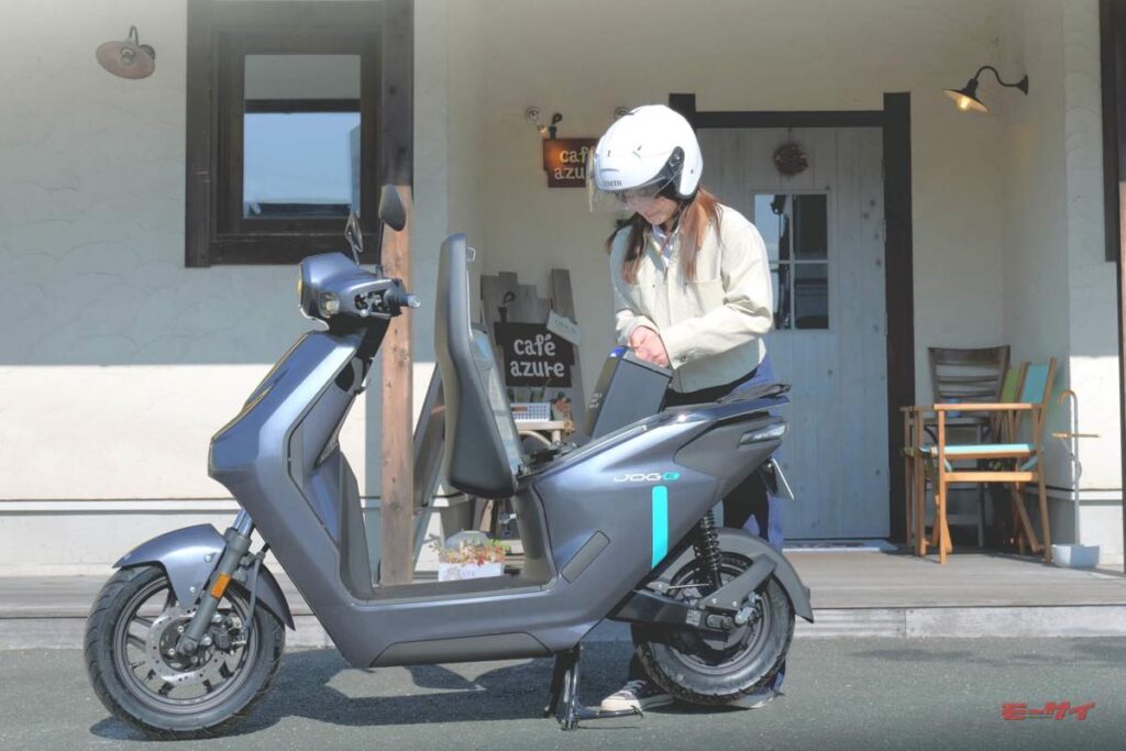「JOG E」は、動力用電源に交換式バッテリー「Honda Mobile Power Pack e:(モバイルパワーパックイー)」をヤマハとして二輪車に初めて採用した原付一種クラスの電動スクーター。なお、今回は車体のみの販売のため、利用に際しては「Gachaco(ガチャコ)※1」が提供する有料のバッテリーシェアリングサービスの契約が必要となる。