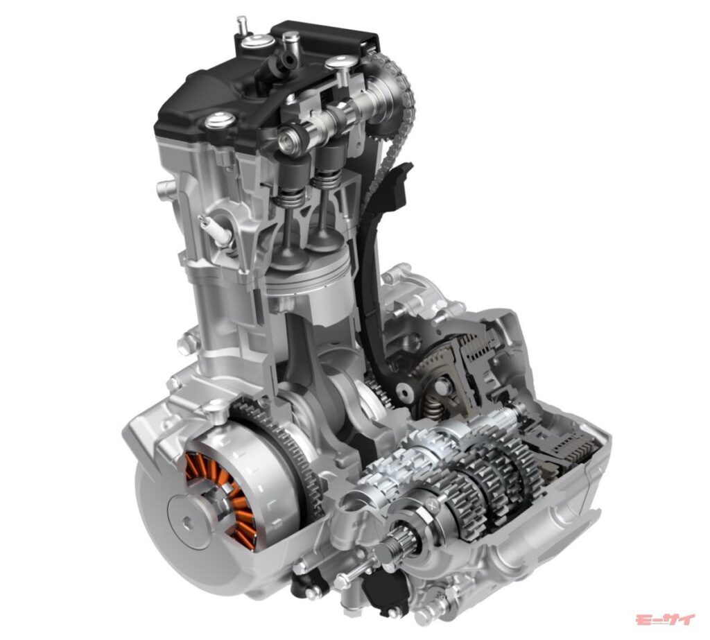 ■エンジン 水冷4ストローク単気筒DOHC4バルブ ボア・ストローク90×62.6mm 排気量398cc 圧縮比11.1 燃料供給装置:フューエルインジェクション 点火方式フルトランジスタ 始動方式セル