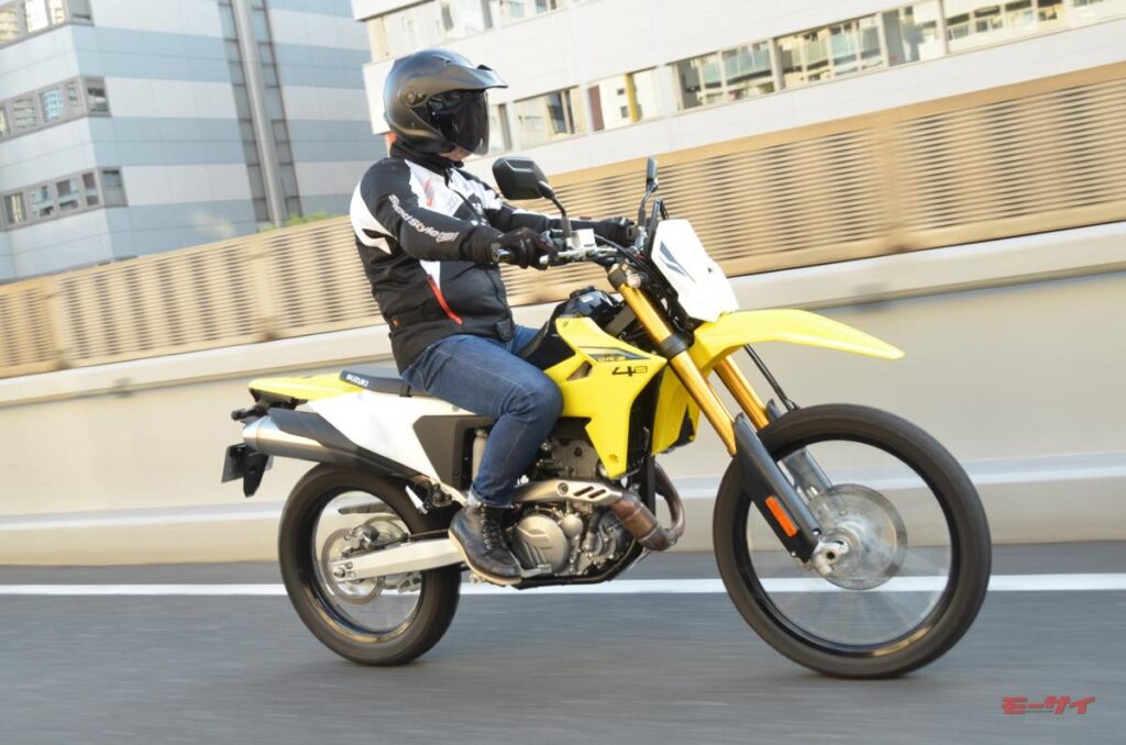 4~5速を駆使する一般道では、普通にスロットルをひねれば常に加速でリードでき、発進では軽二輪や原付二種のスクーターに出足で負けるようなこともない。まさに400ccの機敏なショートストローク型シングルの面目躍如だし、シート高に慣れさえすれば、高いアイポイントから軽い車体をキビキビ操りつつ走れて爽快だ。フレキシブルに効く前後ブレーキも相まって、下道でのDR-Zは優越感を覚える走りを堪能できるだろう。