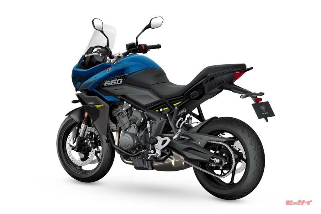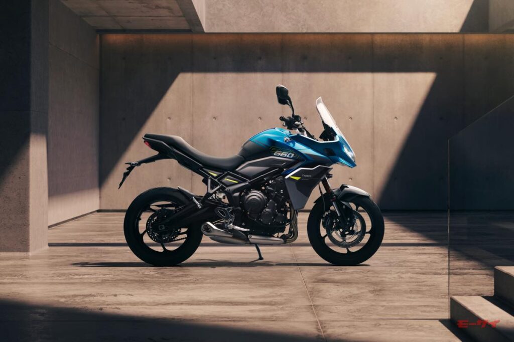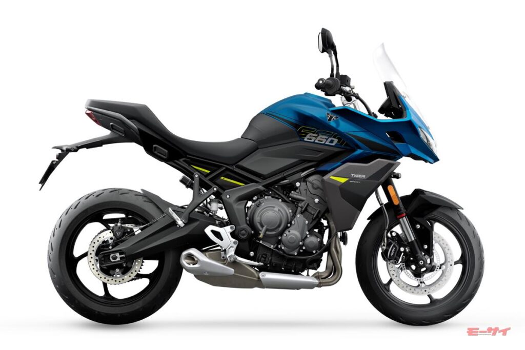 アドベンチャー・スポーツツーリングを担うタイガースポーツ660は、ツーリング性能をさらに強化した。18.6Lの大容量フューエルタンクを新たに採用し、航続距離を延長。さらに、新設計のボディワークとラジエーターカウルにより、防風・防候性能と快適性が向上している。