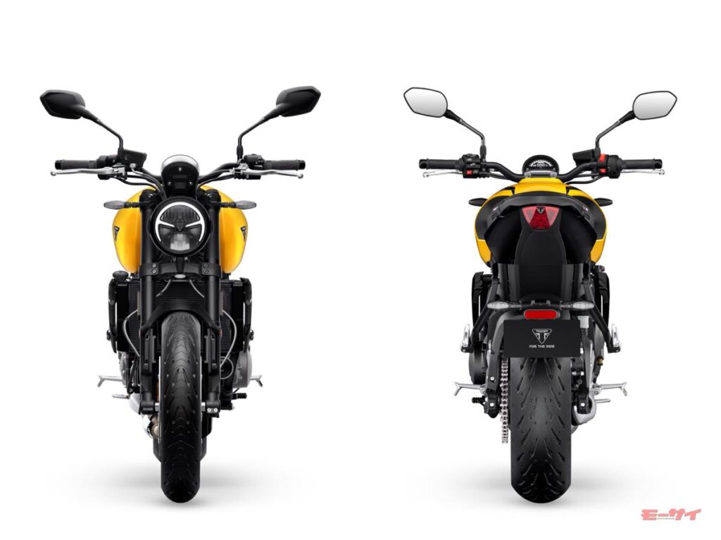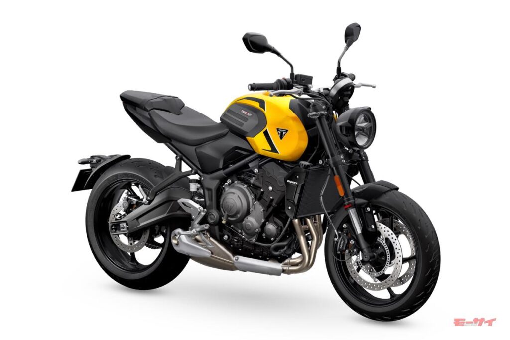 メーターパネルには、カラーTFTディスプレイとLCDスクリーンの組み合わせを採用。「MyTriumphコネクティビティ」も標準装備されており、ターンバイターンナビゲーションやスマートフォンの音楽操作、通話コントロールが可能だ。灯火類は新デザインのDRL(デイタイムランニングライト)一体型ヘッドライトを含むフルLEDとなっている。