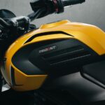 ネイキッドロードスターのトライデント660は、よりスポーティで力強い佇まいへと進化した。新設計のワイドなフューエルタンクには深いニーグリップ形状が施され、ライダーとパッセンジャーのシートを分けたセパレートタイプの新シートを採用している。