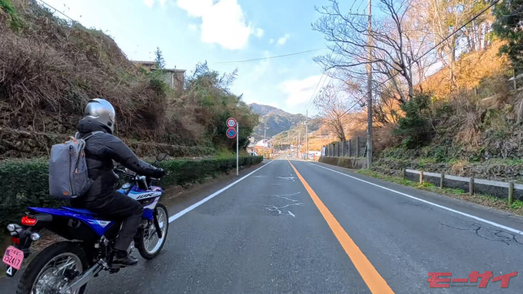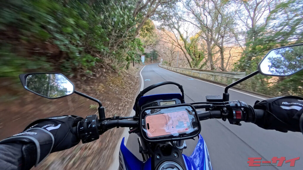 WR125Rの大きな魅力は、全体的な軽さにある。細い道やくねくねとした峠道でもヒラヒラと向きを変え、オンロードバイクとは違う切り返しの軽快さが心地いい。西伊豆のタイトなワインディングでは、この特性が大きな武器になった。