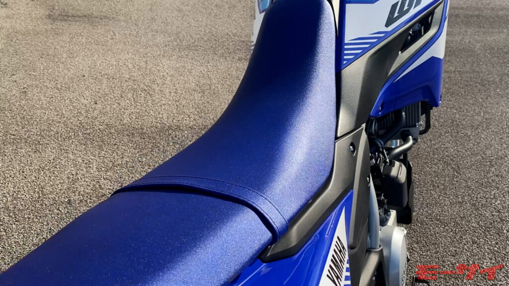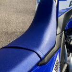 WR125Rシート。車体と同じ群青色が目を惹く
