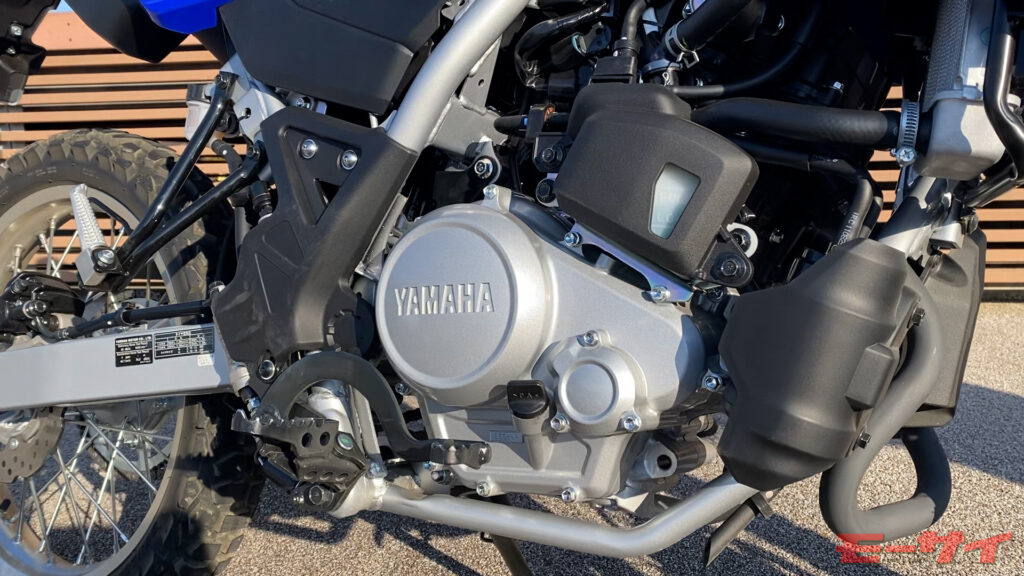 まず跨って感じるのは、125ccの枠を超えた車格の大きさだ。フルサイズトレールらしいプロポーションで、所有感は十分。タイヤはフロント21インチ、リヤ18インチ。シートはかなり高い。