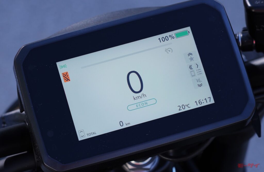 5インチTFTディスプレイの中央部に速度を表示。その下には現在のライディングモード(写真ではイーコン)が表示される。回生ブレーキの減速度は左上の下向き矢印の数で表示される(写真では減速ゼロの状態で、オレンジ色に表示されている)。