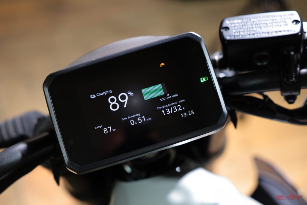 5インチのTFTディスプレイは操作が簡単で、複数の表示オプションが用意されている。バッテリー残量表示は識別しやすく、残りの走行可能距離を表示することもできる。走行モードはスロットルを閉じた状態でイーコン(ECON)、レイン、スタンダード、スポーツの4つを切り替えられるほか、アプリリア製バイクのトラクションコントロール用パドルに似た左スイッチボックスのトリガーで、停車せずに回生ブレーキのレベルを調整できる。