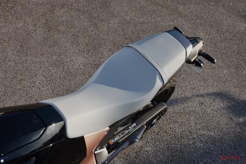 シートは前後一体型で、前後長は通常のネイキッドモデルよりも長く取られている。車体同様、スリムな造形だ。シート高は800mm。