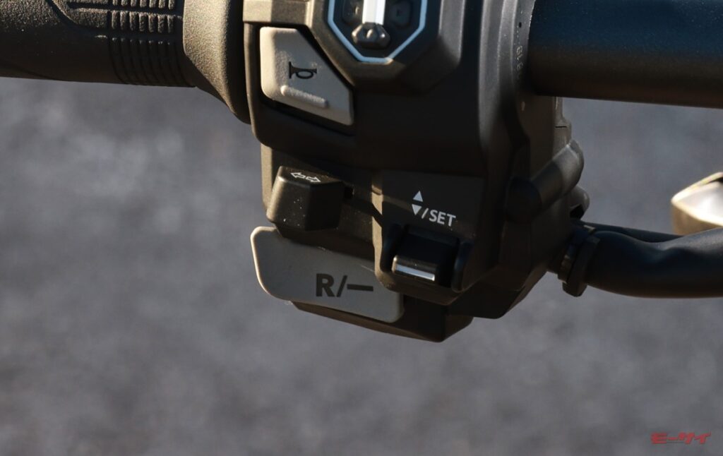 回生ブレーキの減速度を下げるときに使う「R/-」スイッチ。反対側上方にある「F/+」スイッチでは減速度を上げるときに使用する。またこれらのスイッチは、停車時に長押しすると微速後退/前進モードを起動することができる(WN7試乗記前編参照)。
