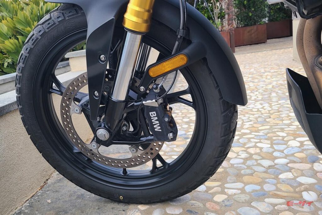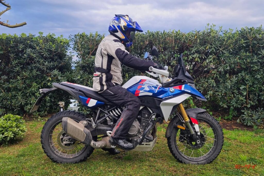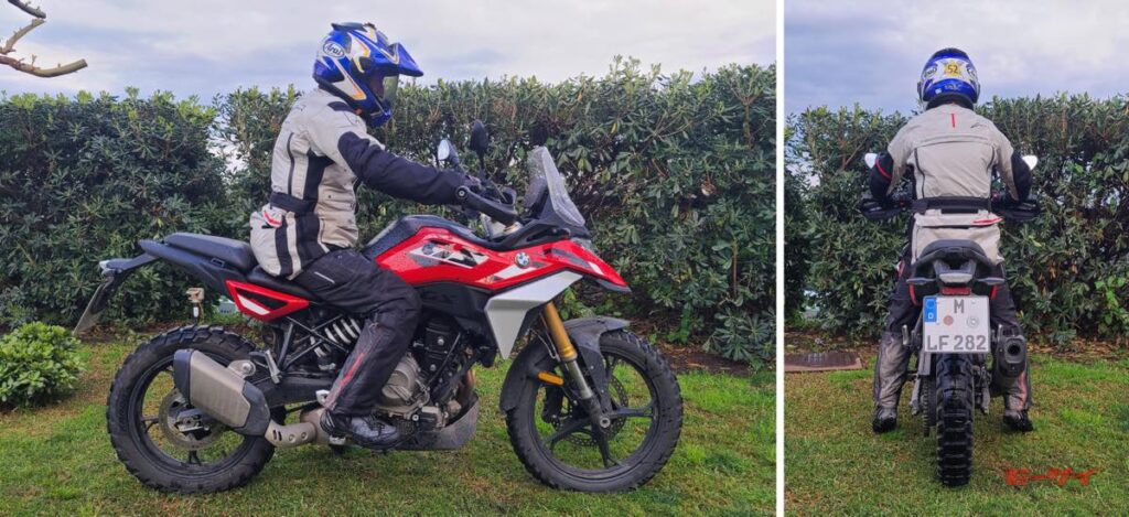 ライディングポジションから見ていこう。ホイールベースはG310GSの1420mmより65mm長い1465mmとなるが、R1300GSに比べるとはるかにコンパクト。扱いやすさとチープ感のなさが同居する絶妙なサイズ感と言える。車体はそれなりの存在感を保ちつつも、内股が当たる部分はスリムに絞られてホールドしやすく、ハンドル幅も拳1個分外側という感じで広すぎないから、Uターンで腕が伸び切る感じも少ない。