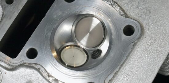 ■掃除して美化した燃焼室と、磨き終えたバルブを仮セット。エンジンを開けて作業するときは排気量問わず…