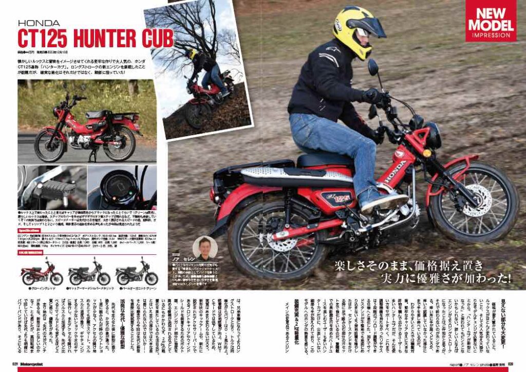 ほかにも、80馬力をたたき出した400cc4気筒のカワサキZX-4Rの詳細解説、新発見続出のCT125・ハンターカブの新旧比較試乗、レブル250、ADV160、ハーレーダビッドソン ブレイクアウトの試乗レポート、バイク旅をグレードアップさせるアイテム特集など、幅広い記事でお楽しみいただけます。