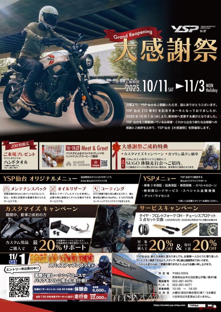 YSP仙台は今回のリオープンを機に、従来からの信頼と実績をさらに強化し、地域に根ざした店舗として一層のサービス向上を目指してまいります。ヤマハ バイクの販売や整備はもちろん、イベントや試乗会を通じて「乗る楽しさ」「所有する喜び」を発信し、ライダーコミュニティの中心となることを目指します。これからも「買う前も、買う時も、買った後も」安心して任せていただけるヤマハ専門店として、東北・宮城エリアのお客様に安心安全で豊かなライディングライフをお届けして参ります。