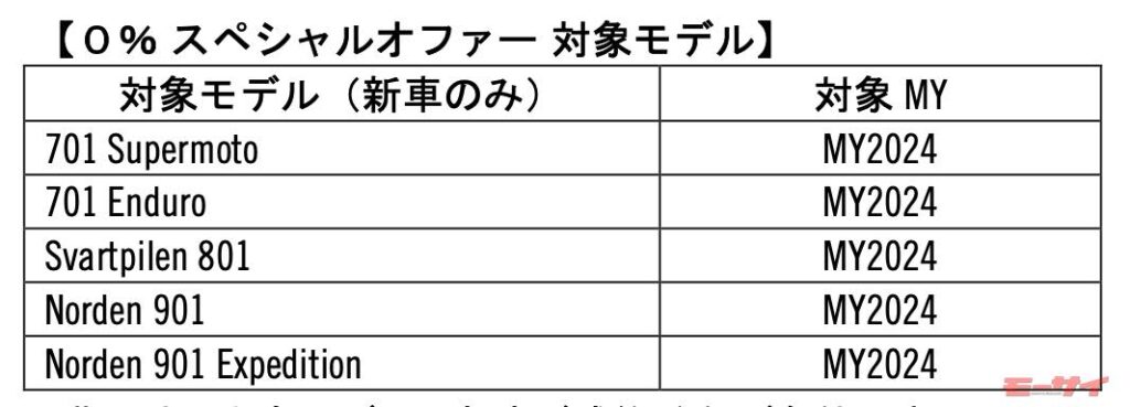 大型モデルが対象となる「Husqvarna 0%スペシャルオファー」は、701スーパーモト、701エンデューロ、スヴァルトピレン801、ノーデン901/901エクスペディションが対象(いずれもMY2024)。こちらはローン金利をKTMジャパンが負担するもので、設定ローンの最長回数は60回・5年。