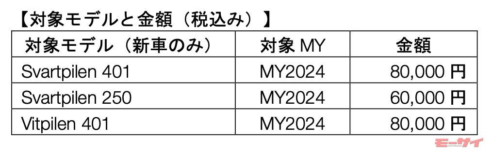 北欧スウェーデンを起源とするハスクバーナは、独特の造形が織りなすデザインが魅力のモデル。そのストリートモデルのミドルクラスを対象に、購入金額をサポートするのが「バースオブ Husqvarnaライダーキャンペーン」。対象モデルとサポート金額は、スヴァルトピレン401とヴィットピレン401が8万円、スヴァルトピレン250は6万円(いずれもMY[モデルイヤー]2024)。
