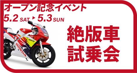 なお、今回のオープニングイベントとして、豪華景品が当たる抽選会のほか、希少な絶版車の試乗会、特選車販売や期間中に当店舗で126cc以上のバイクをご購入された方を対象にVポイントを進呈するキャンペーンを実施。5月2日(土)~3日(日)には以下のオープン記念イベントを実施する。