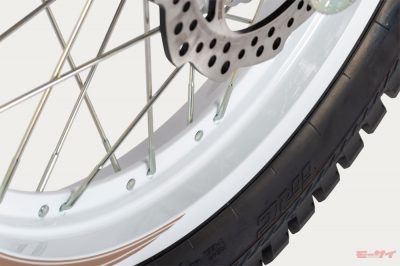 「オフロード女子仕様」のスタイルをグッと引き締めているのが、前後ホイールに施されたパウダーコーティングです。