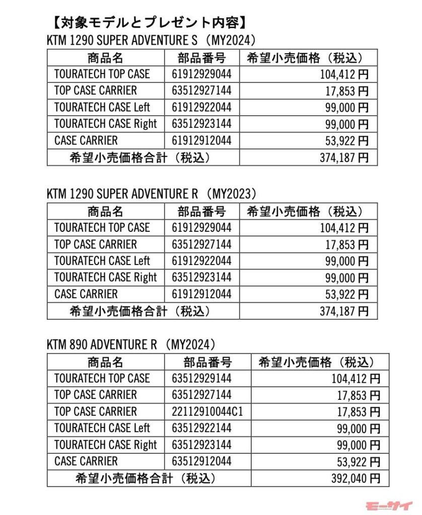 このキャンペーンでは、対象モデルのいずれかの新車を購入すると純正ラゲッジがプレゼントされる(プレゼント品はモデルにより異なる)。ツーリングにも適したアドベンチャーモデルが多いので、この機会にオフに強いKTM車を手に入れよう!