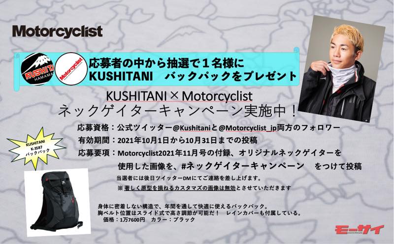 キャンペーンの内容は、ツイッターアカウント@Kushitani(クシタニ公式)および@Motorcyclist_jp(『モーターサイクリスト』公式)の両方をフォローするユーザーが、キャンペーン期間中に『モーターサイクリスト』11月号の特別付録「オリジナルネックゲイター」を使用する写真をハッシュタグ #ネックゲイターキャンペーン をつけて投稿すると、その中から抽選で1名様に「KUSHITANI K-3587バックパック」が当たるというもの。